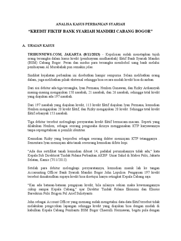 Contoh kasus bank syariah. Dalam transaksi murabahah yang dilakukan oleh bank syariah, bank sebagai penjual harus menyediakan barang untuk Contoh kasus: CV. Mustika, sebuah perusahaan yang bergerak di bidang industri air mineral, membutuhkan 2 unit truk tangki karena permintaan yang meningkat. Analisa kinerja keuangan Bank Syariah ditinjau dari pengaruh eksternal _ Studi kasus Bank Syariah Mandiri periode Januari 2001 - Juni 2003.pdf. Analisa konsentrasi-kompetisi antara Bank Syariah dengan Bank Konvensional - periode 2008-2011.pdf. Bank syariah merupakan salah satu penyedia jasa keuangan syariah yang diberikan kepada Faktor eksternal yang menyebabkan kemacetan di Bank Aman Syariah (BAS) pajak -Contoh Perhitungan Perhimpunan Dana Tabungan Mudharabah Saldo rata-rata tabungan mudharabah Tuan B di PT. General market risk. Studi Kasus: Bank Syariah. Studi Kasus: Bank Syariah. (( Bank Indonesia Membekukan Kegiatan Usaha PT.