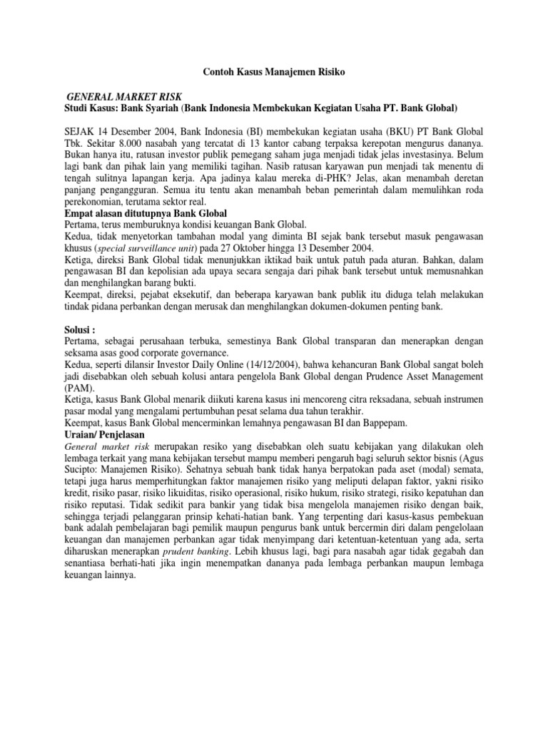 GENERAL MARKET RISK. Studi Kasus: Bank Syariah (Bank Indonesia Membekukan Kegiatan Usaha PT. Bank Global). SEJAK 14 Desember 2004, Bank Indonesia (BI) membekukan kegiatan usaha (BKU) PT Bank Global Tbk.