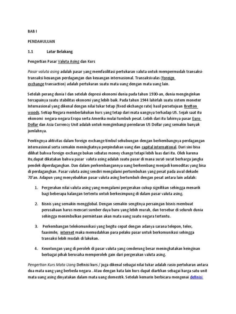 Kurs yang dipakai apabila seseorang membeli mata uang asing kepada bank disebut kurs. Atau juga mentransfer uang untuk anak yang sedang kuliah di luar negeri. Kurs yang dipakai untuk kepentingan seperti ini adalah kurs spot yang ada pada bank atau money changer tempat is menukarkan valas. Sedangkan investor yang memerlukan valas adalah mereka yang pada umumnya berinvestasi pada efek atau surat berharga dalam mata uang asing. April 3, 2021. Kurs Valuta Asing [Pengertian, Perhitungan, Jenis dan Sistem, serta Contohnya] | Kurs ialah harga atau nilai mata uang suatu negara yang diukur dengan mata uang negara asing. Terutama saat mengambil keputusan untuk berbelanja atau membeli barang di luar negeri. Hal yang perlu diperhatikan dan menjadikan hal terpenting adalah ... Jawab: Ya benar, apabila perusahaan MNC meminjamkan uang dengan mata uang lokal di negara perusahaan tersebut maka perusahaan tersebut akan dapat mengurangi resiko valas. Karena perusahaan itu hanya menggunakan mata uang negaranya saja, sehingga tidak mengalami masalah kurs mata uang dengan mata uang negara lainnya. Kurs Mata Uang (Valuta Asing) Oleh kiamuddin 141207964 unit 2 ES. A. Pengertian Valuta Asing dan Mekanisme Kerja Valuta Asing. Valuta asing atau yang biasa disebut dengan valas, atau yang dalam bahasa asing dikenal dengan foreign exchange (Forex) merupakan mata uang yang di keluarkan sebagai alat pembayaran yang sah di negara lain.