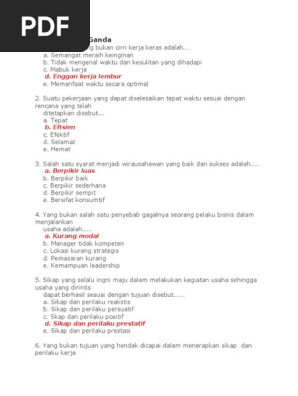 29. Yang bukan salah satu penyebab gagalnya seorang pelaku bisnis dalam menjalankan usaha adalah. . . a. Kurang modal b. Manager tidak kompeten c. Lokasi kurang strategis d. Pemasaran kurang e. Kemampuan leadership. 30. Dibawah ini yang bukan ciri kerja keras adalah…. a...