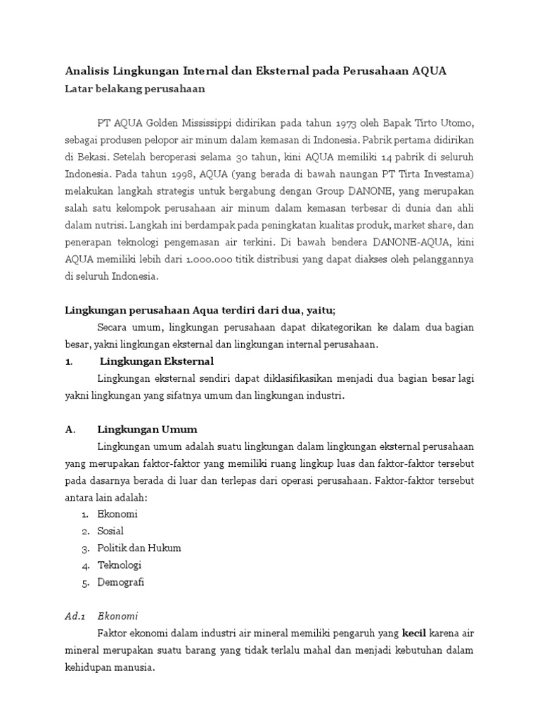 by NW Setyowati · 2015 · Cited by 21 — Pengaruh Lingkungan Eksternal dan Lingkungan Internal Terhadap Keunggulan Bersaing Pada Industri Kecil dan Menengah di Bandung, Jawa Barat. Jan 12, 2017 · Lingkungan eksternal dan lingkungan internal mempunyai peran yang cukup penting dalam usaha pengambilan keputusan guna mewujudkan visi perusahaan ataupun organisasi. Interaksi antar lingkungan internal maupun eksterrnal akan sangat mempengaruhi kemampuan serta strategi-strategi penting bagi para pengambil keputusan.