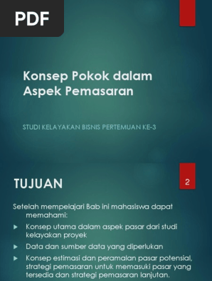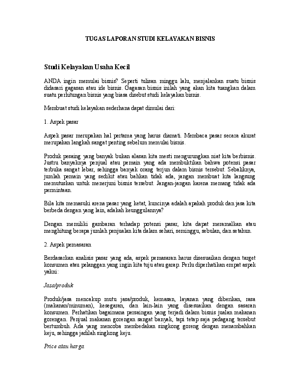 Aspek Pasar Dan Pemasaran (Studi Kelayakan Bisnis) | PDF Dalam kaitan dengan studi kelayakan bisnis suatu usaha atau proyek, aspek pasar dan pamasaran merupakan salah satu aspek yang paling penting. Hal ini disebabkan aspek pasar dan pemasaran sangayt menetukan hidup matinya suatu perusahaan. Apabila aspek pasar dan pemasaraan tidak diteliti secara benar, bagaiman prospeknya dimasa yang akan datang ... Jasa Studi Kelayakan: Hal Penting Pada Aspek Pemasaran Jasa Studi Kelayakan: Hal Penting Pada Aspek Pemasaran. Jasa studi kelayakan merupakan hal penting dalam bisnis karena menjadi acuan utama ketika pemilik bisnis mencari dana segar baik itu dari investor ataupun perbankan. Karena, dengan studi kelayakan maka proposal bisnis yang disusun ataupun bisnis yang berjalan semakin meyakinkan. Studi Kelayakan Bisnis: Pengertian, Contoh dan Tujuannya Dalam penjelasan sederhana, studi kelayakan bisnis adalah studi yang dilakukan seseorang untuk menentukan apakah sebuah bisnis itu layak dijalankan atau tidak. Studi kelayakan bisnis digunakan untuk menguatkan proses pengambilan keputusan tentang sebuah usaha atau proyek dapat dijalankan atau harus dikaji ulang. Studi Kelayakan Bisnis: Pengertian, Aspek, Tujuan, dan ... Pasar dan pemasaran merupakan aspek dasar yang diteliti dalam studi kelayakan. Analisis yang dilakukan pada aspek ini akan menjawab pertanyaan apakah produk yang dihasilkan oleh perusahaan memiliki peluang pasar.