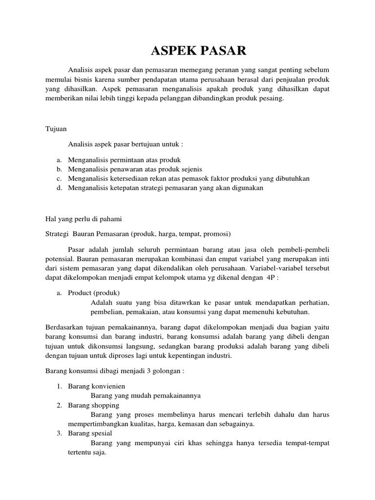 (DOC) Makalah aspek pasar dan pemasaran - Academia.edu Aspek pasar dan pemasaran merupakan salah satu aspek terpenting dalam studi kelayakan bisnis. Jadi hidup matinya suatu perusahaan ditentukan oleh aspek pasar dan pemasaran. Aspek pasar dan pemasaran harus diteliti secara benar agar semua tujuan perusahaan tercapai karena kalau tidak benar bisa saja kondisi perusahaan akan terancam.