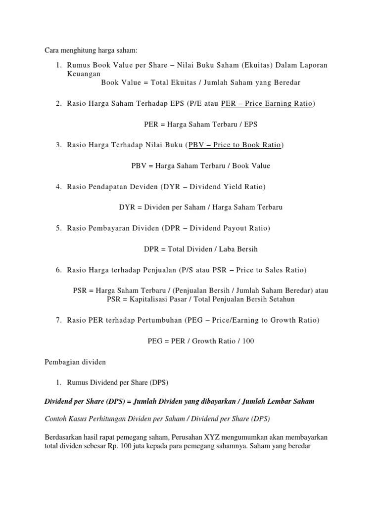 DY = Dividend per Share (Dividen per Lembar Saham) : Market Value... Dividen adalah pembagian laba terhadap pemegang saham yang didasarkan pada jumlah saham yang dimiliki. Selain mendapatkan capital gain, investor juga akan memperoleh dividen saat memutuskan untuk berinvestasi dalam suatu perusahaan. Cara Menghitung Dividen Saham - Ajaib Cara Menghitung Dividen Saham. Laba saham yang didapatkan oleh pemegang saham memiliki nominal yang berbeda-beda. Perbedaan kinerja ini berasal dari dividen yang tampaknya remeh. Meskipun hasil per saham IBM jauh lebih baik, para pemegang saham yang beli Standard Oil dan... Cara Menghitung Dividen per Lembar Saham dan... - Aset.co.id Sebelum lanjut membahas mengenai cara menghitung dividen per lembar saham, ada hal penting lain yang harus Anda ketahui yaitu macam-macam dividen. Cara perhitungan dalam dividen saham umumnya berdasarkan pada proporsi jumlah saham yang dimiliki shareholder. Prosedur dan Cara Hitung Pembagian Dividen Investasi Saham Pembagian dividen dari investasi saham dilakukan sesuai prosedur dan cara hitung tertentu. Cara hitung pembagian dividen saham. Seperti yang disebutkan sebelumnya, setiap investor saham akan mendapatkan dividen Jumlah dividen per saham= total nominal dividen : jumlah saham beredar.