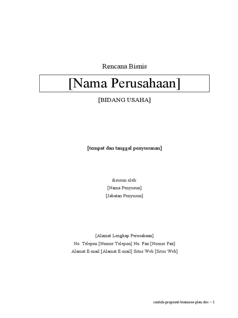 Contoh Proposal Usaha atau Rencana Bisnis 1. Rencana Bisnis [Nama Perusahaan] [BIDANG USAHA] [tempat dan tanggal penyusunan] disusun oleh: [Nama Penyusun] [Jabatan Penyusun] [Alamat Lengkap Perusahaan] No. Telepon [Nomor Telepon] No. Fax [Nomor Fax] Alamat E-mail [Alamat E-mail] Situs Web [Situs Web] contoh-proposal-business-plan-140430003624-phpapp01.doc − 1