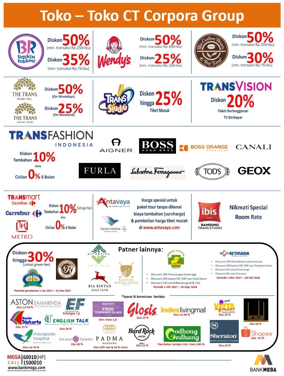 MegaFirst Infinite Credit Card - Bank Mega Kartu kredit yang khusus diberikan kepada nasabah MegaFirst yang merupakan layanan priority banking Bank Mega. Dengan memiliki MegaFirst Infinite Credit Card, Anda mendapatkan benefit terbaik yang diberikan oleh seluruh perusahaan yang tergabung dalam CT Corp dan merchant - merchant lain yang bekerjasama dengan Bank Mega.