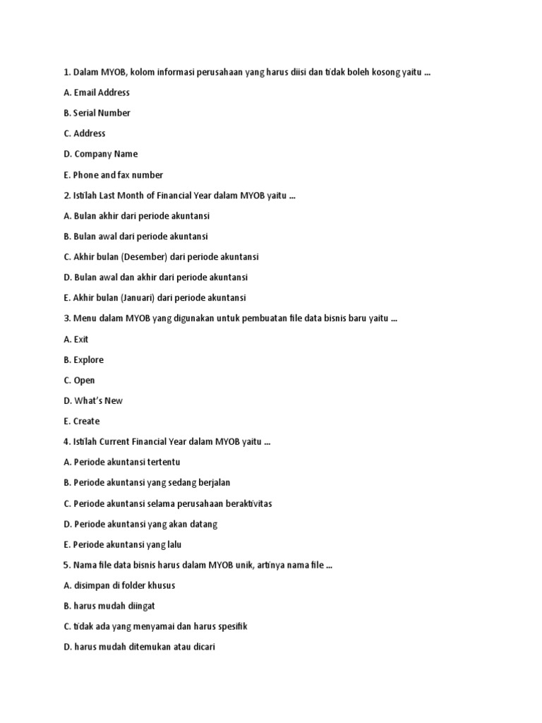 50 Soal Komputer Akuntansi MYOB Perusahaan Jasa ... - Muttaqin 3. Menu dalam MYOB yang digunakan untuk pembuatan file data bisnis baru yaitu … A. Exit B. Explore C. Open D. What's New E. Create 4. Istilah Current Financial Year dalam MYOB yaitu … A. Periode akuntansi tertentu B. Periode akuntansi yang sedang berjalan C. Periode akuntansi selama perusahaan beraktivitas D. Periode akuntansi yang akan ...