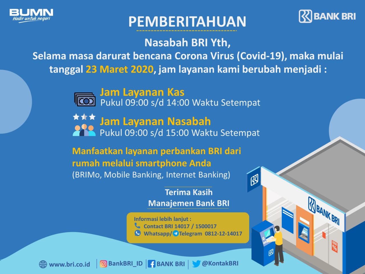 Jam kerja bank BRI selama pandemi berbeda dengan jam kerja normal bank BRI sebelum pandemi. Perubahan ini dilakukan untuk membatasi melakukan kegiatan diluar rumah dan menghindari kerumunan, namun bagi yang belum tau jadwal hal ini justru bisa menimbulkan kerumunan.