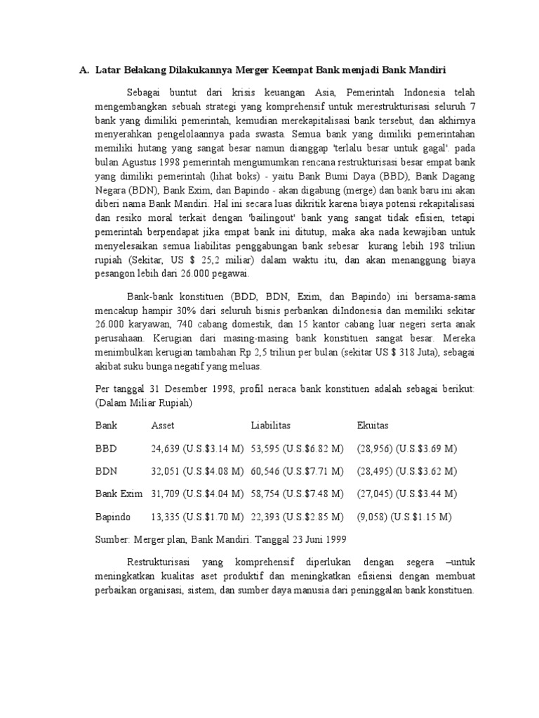 Merger Bank Mandiri MERGER PT.Bank Mandiri (Persero). BAB I. PENDAHULUAN. Latar Belakang Masalah. Seiring dengan berkembangnya perekonomian di Indonesia, maka. Persaingan dalam dunia bisnispun juga sangat dirasakan oleh para pengusaha.