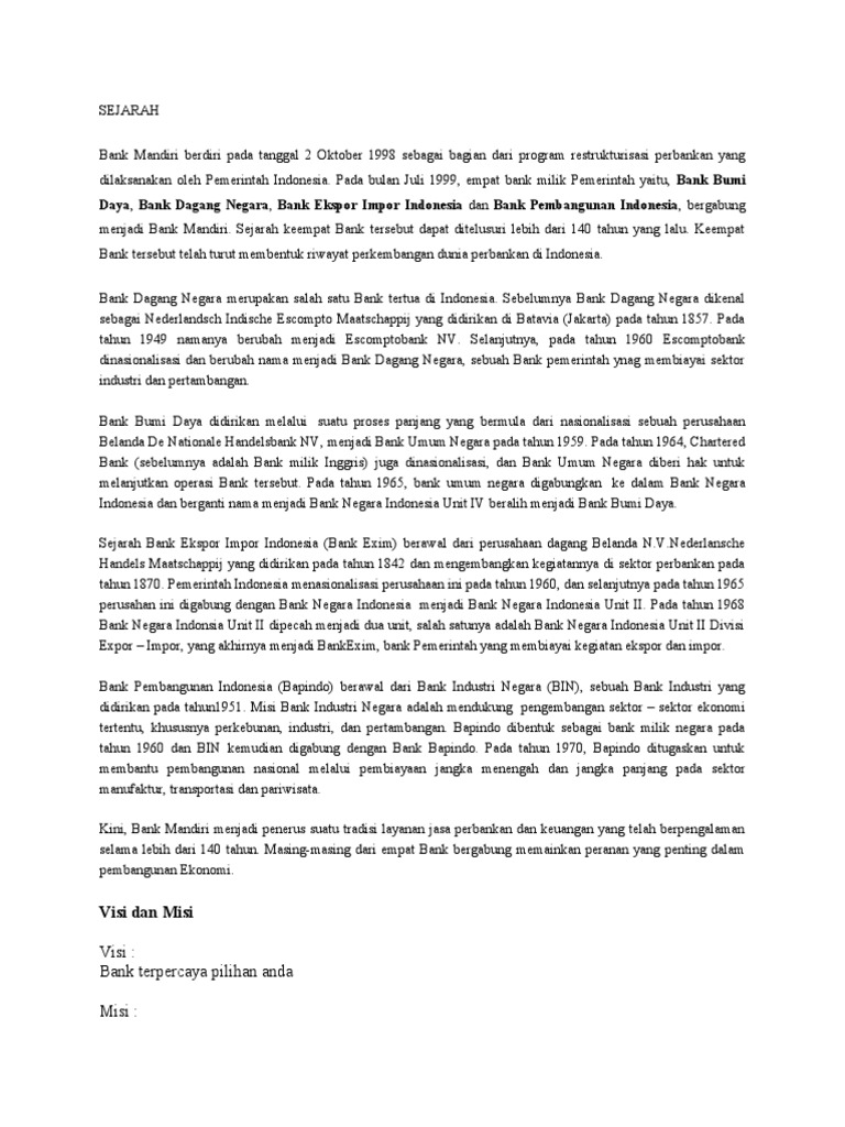 Latar belakang bank mandiri. Bank Mandiri - Wikipedia bahasa Indonesia, ensiklopedia bebas Bank Mandiri (IDX: BMRI) adalah bank yang berkantor pusat di Jakarta, dan merupakan bank terbesar di Indonesia dalam hal aset, pinjaman, dan deposit. Bank ini berdiri pada tanggal 2 Oktober 1998 sebagai bagian dari program restrukturisasi perbankan yang dilaksanakan oleh Pemerintah... A. Latar Belakang Bank Syari'ah 2. Bagaimana latar belakang berdirinya perbankan syari'ah di Indonesia ? 3. Berapa jumlah bank umum syari'ah yang beroperasi di Indonesia ? Bank Syariah Mandiri (BSM) anak perusahaan Bank Mandiri, bank BUMN terbesar di Indonesia. Selanjutnya menyusul kemunculan PT. Latar Belakang - CSR | Mandiri Search Portlet Latar Belakang WMM. Latar Belakang Wirausaha Muda Mandiri. Wirausaha/ entrepreneur merupakan elemen penting perekonomian suatu negara dan merupakan salah satu indikator kemajuan ekonomi suatu negara. PDF 1.1 Latar Belakang Bank merupakan salah satu urat nadi... 1.2 Perumusan Masalah Berdasarkan latar belakang penelitian yang telah diuraikan, maka dapat. dirumuskan masalah penelitian sebagai berikut : 1. Apakah kualitas layanan memiliki pengaruh positif signifikan terhadap. loyalitas nasabah bank BCA ?