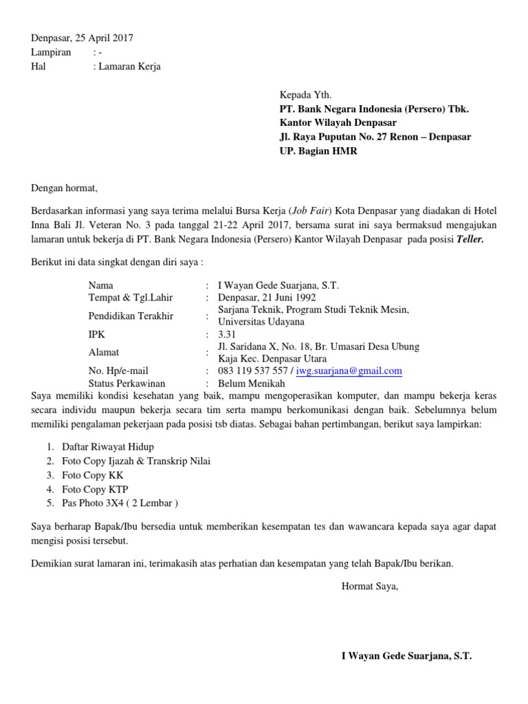 Surat lamaran kerja bank bni