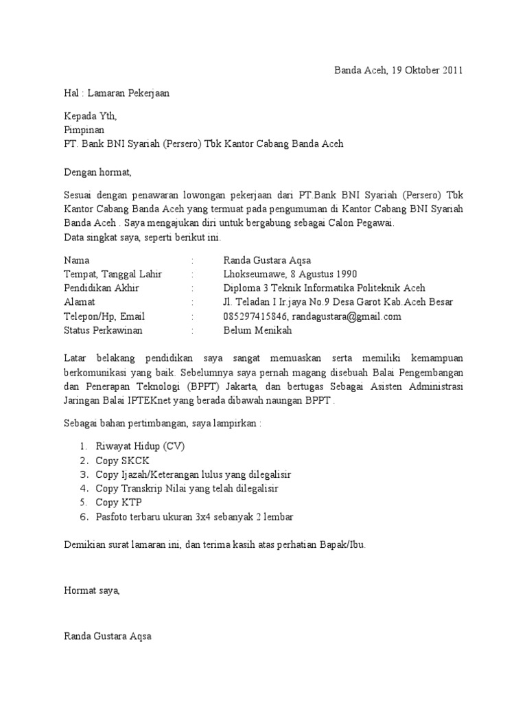 (DOC) Contoh Surat Lamaran Kerja Bank BNI - Academia.edu Download Free PDF. Contoh Surat Lamaran Kerja Bank BNI. bergabung di perusahaan yang Bapak/Ibu Pimpin, saya akan melakukan yang terbaik untuk Bank BNI. Atas perhatian dan kebijaksanaan saya ucapkan terima kasih.