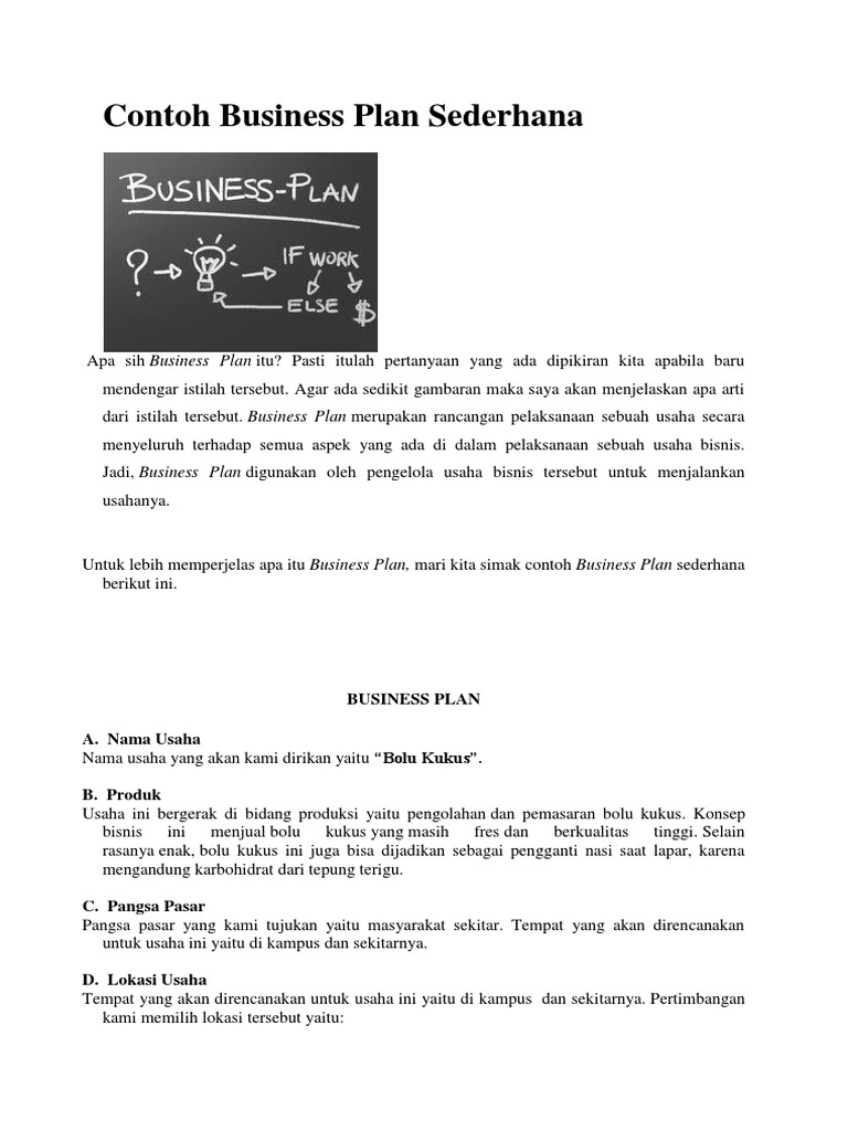 Contoh Bisnis Plan Sederhana Supaya Lolos - Tempat Asik Contoh bisnis plan akan kami bagikan untuk Anda yang akan membuat proposal usaha supaya lolos. Proposal usaha dan business plan adalah sebuah alat yang biasa digunakan oleh setiap pemilik usaha untuk menjelaskan jenis usahanya kepada calon rekan maupun investor. Contoh Proposal Bisnis Plan yang Menarik & Bagus | JalanTikus Demikian informasi lengkap mengenai contoh proposal bisnis plan yang bisa Jaka jelaskan di artikel kali ini. Meskipun contoh proposal rencana bisnis yang Jaka berikan di atas terbatas untuk jenis usaha cafe, tetapi bisa kok kamu jadikan inspirasi untuk membuat proposal di jenis bidang usaha lainnya... Contoh Proposal Bisnis Plan PDF Lengkap - Pinhome Bisnis plan atau gagasan usaha sendiri pada umumnya dapat disimpulkan sebagai perincian info yang berisi tingkatan dalam membuat sebuah usaha/usaha dimulai dari 0 sampai lebih kurang sepanjang 5 tahun ke depan. Jadi bisnis plan adalah asset penting yang perlu dipunyai supaya usaha dapat... Contoh Bisnis Plan, Penjelasan dan Cara Membuat Bisnis Plan Berikut adalah penjelasan lengkap mengenai bisnis plan, alasan harus membuatnya, hingga contoh bisnis plan yang sederhana. Dokumen contoh bisnis plan juga harus dilengkapi dengan struktur organisasi. Jadi, bisa dilihat siapa yang memimpin, siapa yang bertugas untuk bagian produk...