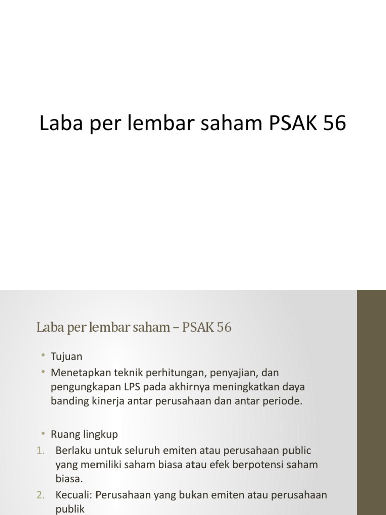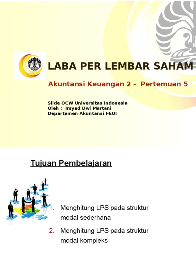 (PPT) LABA PER LEMBAR SAHAM | ikhsan junaedi - Academia.edu LABA PER LEMBAR SAHAM (EARNING PER SHARE) KELOMPOK 5 ASRI IKHSAN JUNAEDI IMAS HAMDAH FATIMAH TRI SOFYANI D Perhitungan Laba per Lembar Saham Struktur Modal Struktur Modal Kompleks Sederhana Earnings per share menunjukkan laba yang diperoleh oleh setiap lembar saham biasa.