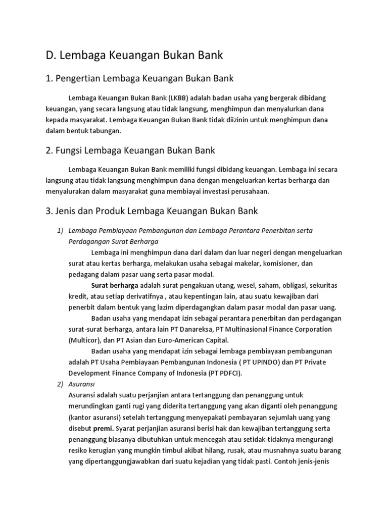 (DOC) Jenis-jenis dan produk Lembaga Keuangan Bukan Bank ... Jenis-jenis dan produk Lembaga Keuangan Bukan Bank (LKBB) 1. Lembaga pembiayaan Lembaga pembiayaan merupakan badan usaha yang melakukan kegiatan pembiayaan dalam bentuk penyediaan dana atau modal dengan tidak menarik dana seacara langsung dari masyarakat.
