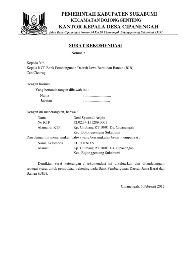 Contoh Surat Pengantar Permohonan Kredit Kyg Ke Bank ... Contoh surat pengantar permohonan kredit kyg ke bank, mungkin ini bisa jadi contoh untuk perusahaan anda yang mau ajukan kredit. Lompat ke konten Lompat ke sidebar Lompat ke footer Blog Property Jambi. Rumahku,Rumahmu dan Rumahkita,Blog khusus untuk berbagi tentang dunia property jambi ... format-administrasi-desa.blogspot.com › 2021 › 01Surat Keterangan Desa (Kumpulan Contoh, Pengertian, Jenis ... Pemerintah Desa (dalam hal ini Kepala Desa) tidak dibenarkan untuk memungut biaya dari masyarakat yang akan mengurus surat keterangan, sebagaimana hal juga dengan surat pengantar dan surat rekomendasi. Jika ada yang mematok harga tertentu sebagai syarat untuk pembuatannya, maka itu sudah termasuk pungutan liar (PUNGLI). Contoh Surat Pengantar Pembuatan Rekening Bank dari ... Contoh Surat Pengantar Pembuatan Rekening Bank dari Sekolah. 0 minute read. Berikut ini contoh surat pengantar pembuatan rekening bank dari Kepala Sekolah diberikan kepada Guru yang hendak membuat rekening penerima tunjangan sertifikasi. UNDUH FILE DISINI. Contoh surat permohonan perubahan specimen rekening BANK ... Baiklah langsung saja jadi kali ini saya akan berbagi tentang Contoh surat permohonan perubahan specimen rekening BANK atau Contoh surat permohonan perubahan tanda tangan pada rekening BANK karena perubahan bendahara. seperti yang telah saya sampaikan pada artikel sebelumnya bahwa saya akan juga membagian contoh format surat perubahan spesimen ...