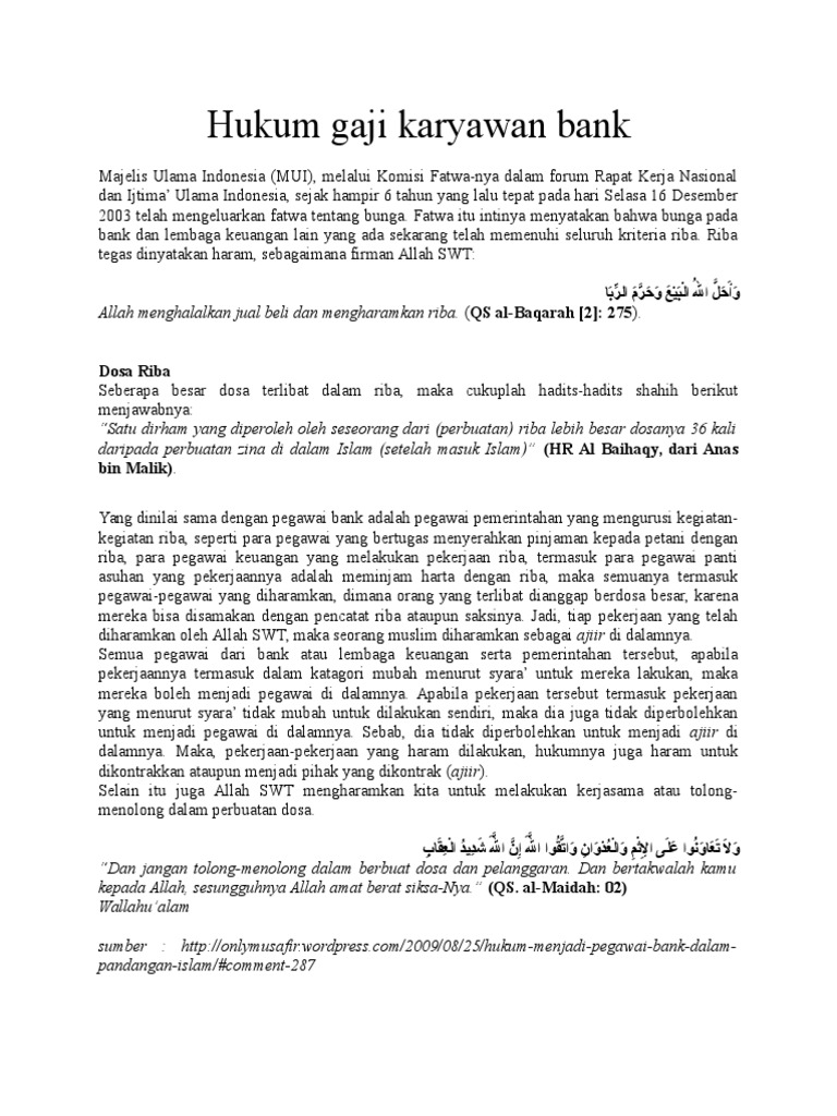 Hukum Menerima Upah dari Bank Konvensional - Terminal ... 3 May 2021 — Gaji seorang pegawai bank, atau pegawai lembaga perkreditan, adalah halal, karena ia dikaji karena faktor jerih payahnya dalam bekerja mencatat ... Apakah Gaji Pegawai Bank BUMN termasuk Riba? | NU Online Apakah Gaji Pegawai Bank BUMN termasuk Riba? Ustadz saya pegawai bank konvensional di salah satu bank BUMN. Dari berbagai situs dan tulisan bahwa pegawai yang bekerja di bank konvensional itu gaji/penghasilannya dihukumi riba. Mohon tanggapannya untuk memperjelas saya dalam mencari nafkah untuk keluarga.