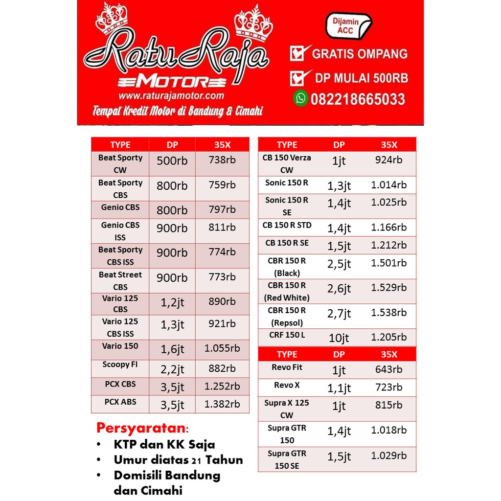 Kredit Motor Honda, DP dan Cicilan Murah, Dealer Resmi ... Ajukan Kredit Motor Honda di sini! Bandingkan dan dapatkan kredit motor dengan DP dan cicilan ringan dari dealer resmi Honda sekarang juga! ... Honda Vario 4.65 / 5 Cicilan. Rp562.000. Rp2.750.000. Uang Muka. Rp2.750.000. Harga. Rp16.725.000 Ajukan Sekarang ...