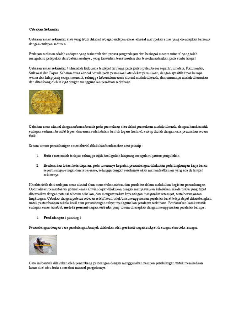 PEMURNIAN LOGAM EMAS (Au) DAN EKSTRAKSI PERAK ... by W Margayanti — Amalgam ini mengandung beberapa logam antara lain emas, perak, ... Penggunaan pelarut asam sulfat bertujuan untuk memisahkan perak dengan cara di dalam ... tatacara menambang yang benar: CARA MEMISAHKAN EMAS DENGAN ... Jan 21, 2016 · CARA TERCEPAT PENGOLAHAN EMAS. 1. LARUTKAN PROGOLD ( 1 KG/ TON KERIKIL ) + PRO GOLD PLUS ( 1 KG / TON KERIKIL ) + 30 LITER AIR BERSIH + HNO3 SEBANYAK 4 LITER. KEMUDIAN ADUK MERATA DAN DISIRAMKAN KE DALAM KERIKIL / LUMPUR KERING DENGAN GEMBOR TANAMAN AGAR MERATA. BIARKAN SELAMA 48 JAM ( 2 HARI 2 MALAM ).