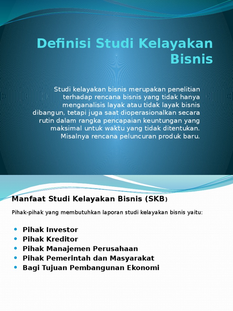 Pengertian Studi Kelayakan Bisnis | PDF Pengertian Studi Kelayakan Bisnis menurut Kasmir dan Jakfar (2003) adalah suatu kegiatan yang mempelajari secara mendalam tentang suatu kegiatan atau usaha yang akan dijalankan, untuk menentukan layak atau tidaknya suatu bisnis dijalankan.tujuan utama dilakukan studi kelaykan...