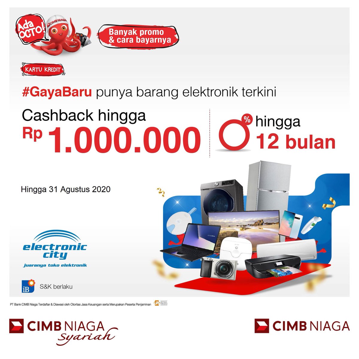 Electronic City Promo Cashback Rp 1.jt dengan Kartu Kredit ... Electronic City Promo Cashback Rp 1Jt dengan Kartu Kredit CIMB Niaga berlaku mulai 25 - 31 Desember 2020. Joyful December with CIMB Niaga! Belanja elektronik jadi lebih hemat, kamu bisa nikmati cashback hingga 1 juta dengan menggunakan kartu kredit CIMB Niaga, promo ini berlaku di seluruh toko Electronic City loh, Yuk buruan belanja.