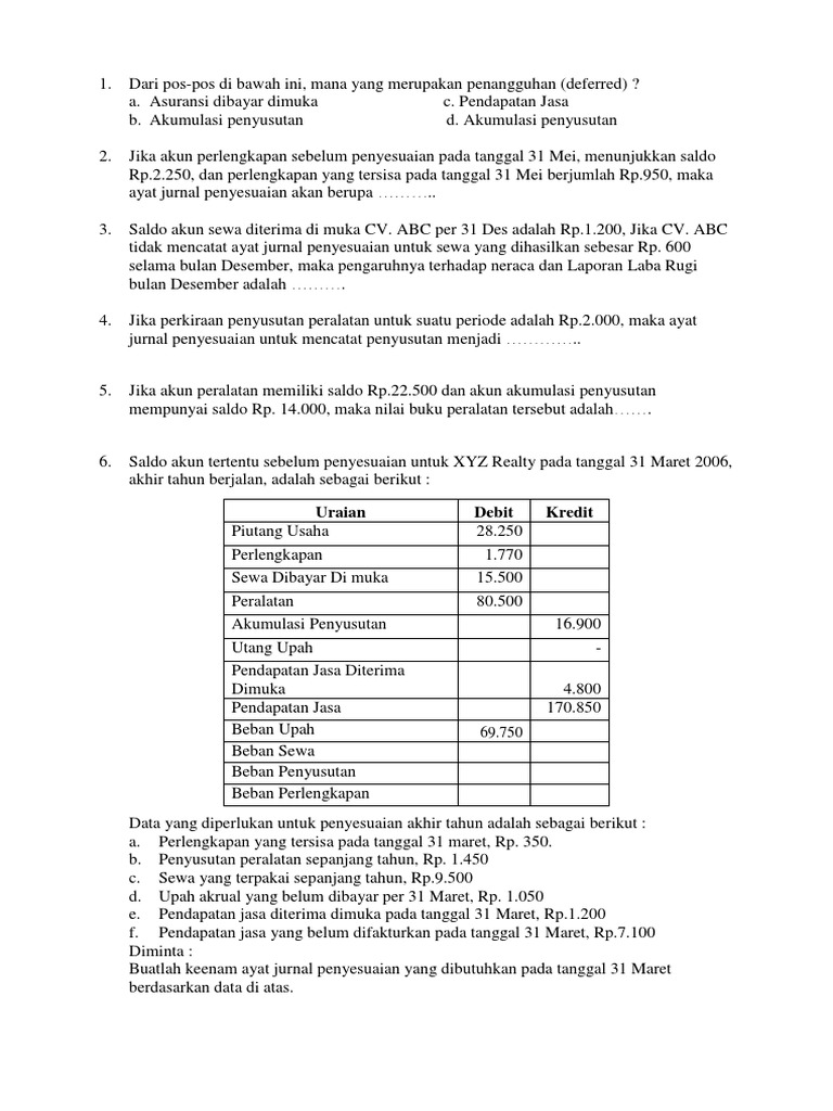 PDF JURNAL PENYESUAIAN - Semara Asuransi dibayar di muka adalah pembayaran premi asuransi untuk 2 tahun, terhitung mulai tanggal 1 April 2006. 2. Depresiasi peralatan Rp. 475.000,00 per bulan. 3. Surat wesel tertanggal 1 April dengan jangka waktu 6 bulan dan bunga 12%. 4. Pada tanggal 1 April 2006 perusahaan menerima pembayaran di muka dari sejumlah