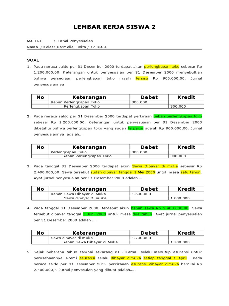 Biaya Dibayar Dimuka: Pengertian, Jenis, dan Cara Membuat ... Biaya dibayar dimuka adalah biaya yang dibayar sebelum menggunakan jasa atau barang yang Anda akan gunakan. Anda dikenakan biaya ini ketika Anda membayar sesuatu yang akan Anda terima dalam waktu dekat. Setiap kali Anda membayar sesuatu sebelum menggunakannya, Anda harus mencatatnya melalui entri biaya dibayar dimuka. Soal jurnal penyesuaian - SlideShare Asuransi dibayar dimuka merupakan pembayaran premi asuransi untuk jangka waktu 6 bulan yang terhitung mulai tanggal 1 oktober 2008 9.000.000/6 x 3=4.500.000 Beban asuransi 4.500.000 Asuransi dibayar dimuka 4.500.000 4. 3.