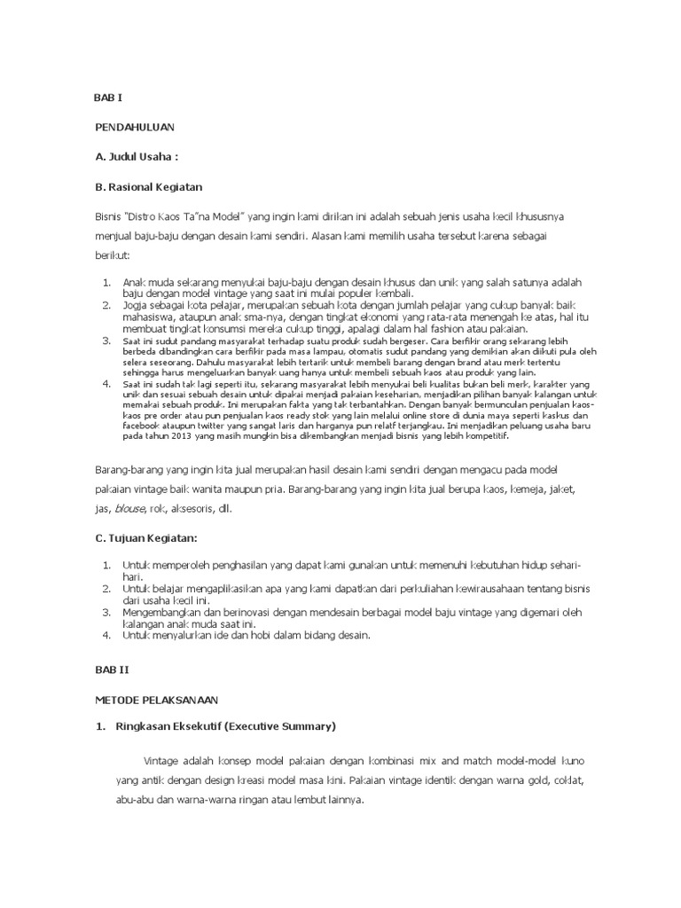 (PDF) Contoh Rencana Bisnis | Agung Patara - Academia.edu Kami menjalankan ide bisnis ini hanya sebagai perantara pemesanan saja, kami tidak mempunyai alat-alat untuk memproduksi kaos. perusahaan 3. Melakukan tindak lanjut pelayanan, 3. Membuat perencanaan usaha kede- untuk memberikan kepuasan kepada pannya konsumen.