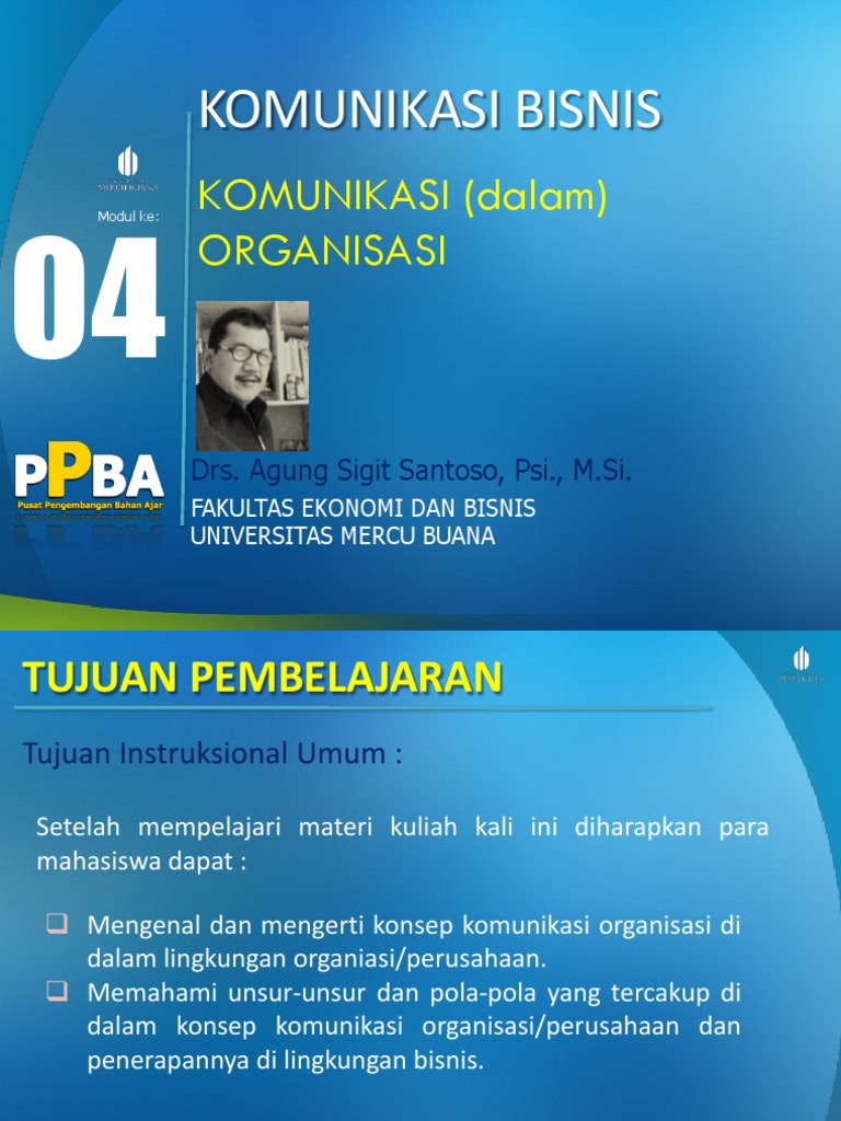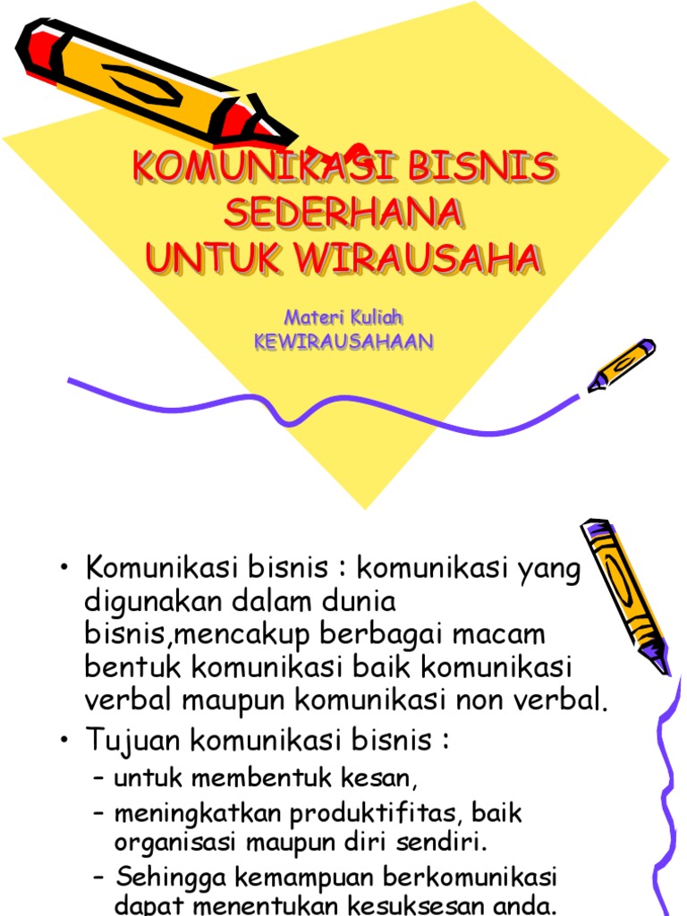 Materi Kuliah KOMBIS ~ BEM STIKOM SAMARINDA PERENCANAAN PESAN-PESAN BISNIS.ppt 03. MEMAHAMI KOMUNIKASI BISNIS.ppt 04. Materi Kuliah KOMBIS. Kali ini saya mau berbagi bahan kuliah komunikasi bisnis, jika anda berminat anda dapat mendownload di tempat yang saya berikan. PDF Microsoft Word - BUKU AJAR - KOMUNIKASI BISNIS.docx Bab I komunikasi dan komunikasi bisnis. A. Pendahuluan Sekarang ini permasalahan dalam berbisnis menjadi semakin komplek. Sumber: Materi Pekerti UT (2005) Karena itu audien atau komunikan ini bisa menafsirkan isi pesan itu menurut versi pemikirannya, inilah yang disebut...