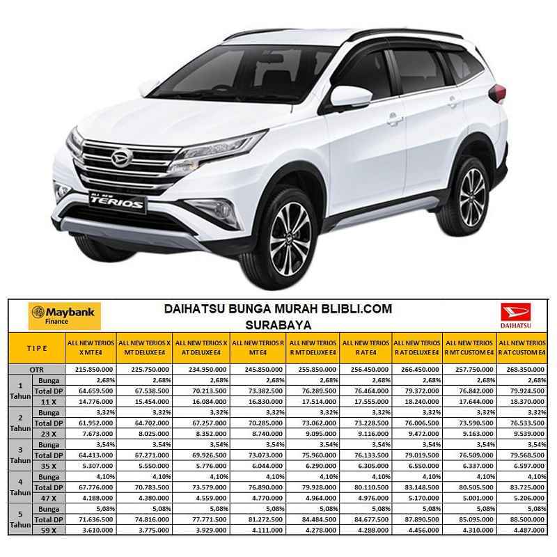 Promo Harga Simulasi Kredit Daihatsu Terios Dp Murah ... Nah untuk mengetahui harga All New Daihatasu Terios setiap tipenya, silahkan simak dibawah ini. Berikut spesifikasi daihatsu All New Terios Simulasi kredit All New Terios Terbaru 2019 * TDP net -Rp 4000.000 ( Diskon) * 1.Mandiri Utanma Finance * 2.OTO Multhi Artha * 3.BCA Finance Spesifikasi Daihatsu ALL NEW TERIOS Kenapa harus di dealer kami ? 1.