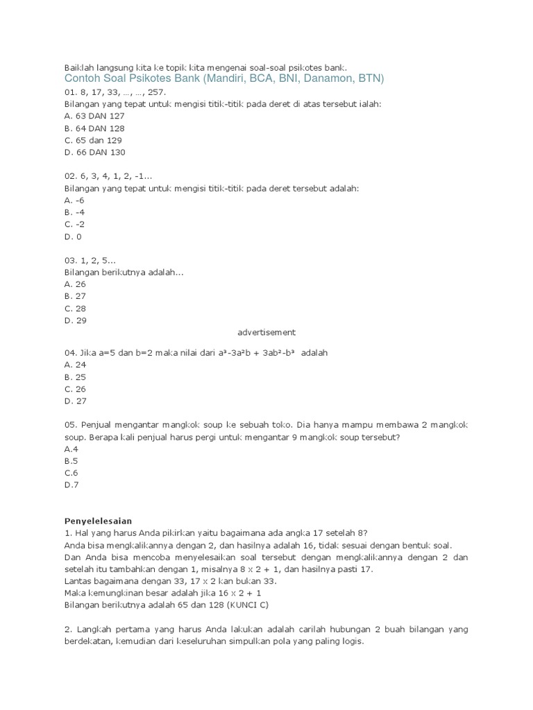 Contoh soal psikotes bank pdf. › Tes-Pisikotes-BankpdfTes Pisikotes Bank.pdf - Contoh Soal Psikotes BUMN & TPA Bank ... View Test Prep - Tes Pisikotes Bank.pdf from FAKULTAS I 0831808866 at University of Brawijaya. Contoh Soal Psikotes BUMN & TPA Bank BRI Jawabannya Gratis Pdf Download Soal Psikotes dan TPA BRI BRI - Soal Olimpiade Vektor Matematika SD MI - CLUZINESIA - Bank ... A. Contoh Soal Bagian 1 Olimpiade Matematika. Berikut adalah soal bagian 1 untuk olimpiade matematika. Soal berikut merupakan soal pilihan ganda (PG) yang disertai dengan 4 nomor jawaban yang harus dipilih. Silahkan kerjakan masing-masing soal dengan benar dan tepat. Soal Bagian 1: Pilihlah Jawaban Yang Tepat! EOF › soal-psikotes-bank-bri-pdfSoal Psikotes Bank Bri Pdf | Literaturku Dec 05, 2021 · Home contoh soal psikotes soal psokotes dan tpa bank bri contoh soal psikotes bumn tpa bank bri jawabannya gratis pdf download soal psikotes dan tpa bri pt bank rakyat indonesia persero tbk atau bank bri saat ini menjadi salah satu dari 7 perusahaan terbesar di indonesia berdasarkan sumber data diperoleh dari majalah forbes pada bulan mei 2015.
