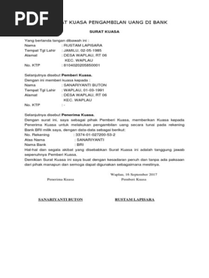Surat kuasa pengambilan uang di bank bri